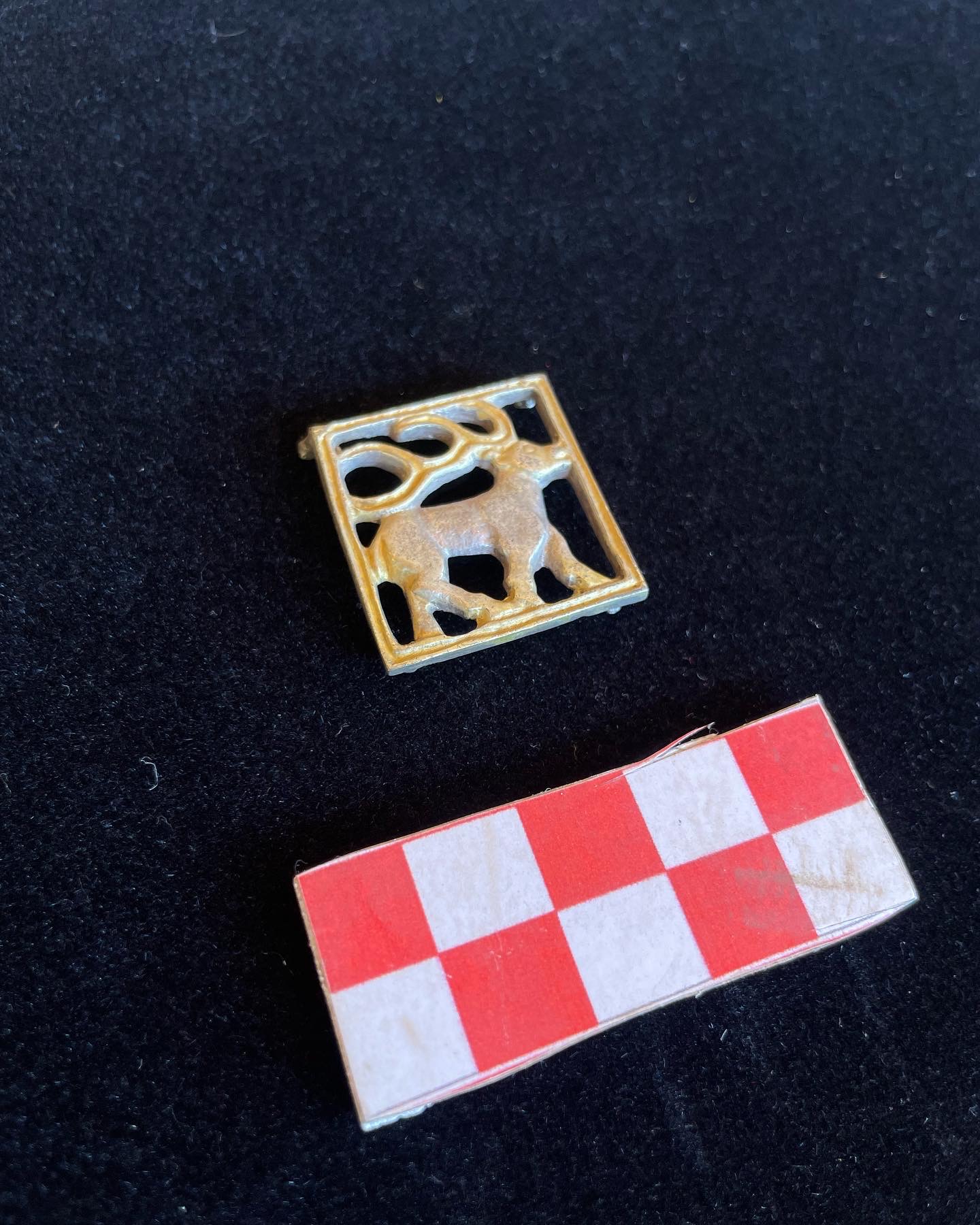 Курган N 9. В верхней части колчана была размещена ажурная квадратная бляшка с изображением фигуры оленя. Бляшка ажурная квадратная с изображением фигуры оленя в профиль,идущим. Показаны небольшой хвостик, массивный ствол рога с тремя отростками. Размер : 2,5*2,5 см. Автор раскопок: З. Самашев.