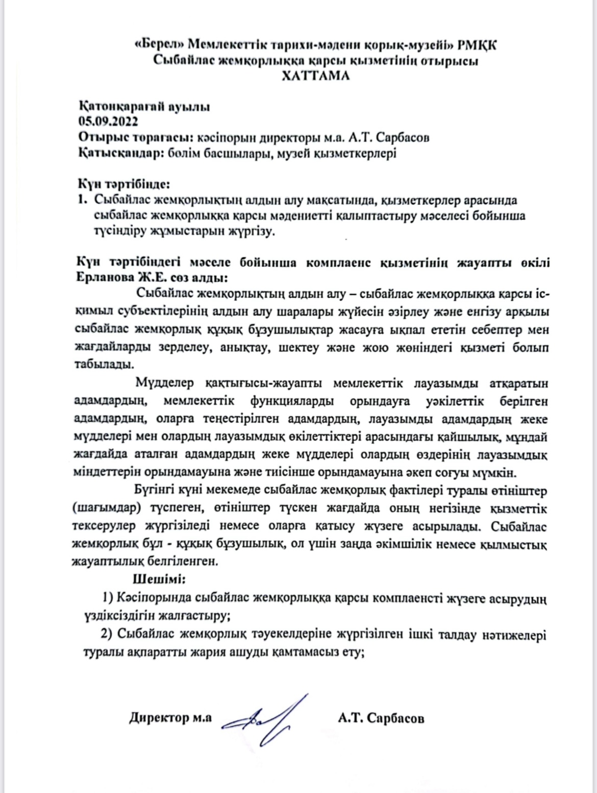 Ответственное лицо на которое возложены функции комплаенса по противодействию коррупции Государственного историко-культурного музея-заповедника «Берел» провела разъяснительную работу по вопросу формирования антикоррупционной культуры.