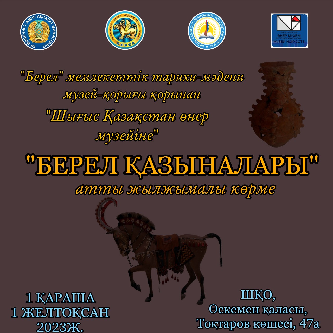 “Шығыс Қазақстан өнер музейі” КМҚК-да Берел музей-қорығының қорынан ұйымдастырылатын “Берел қазыналары” атты жылжымалы көрменің ашылу салтанатына шақырамыз!