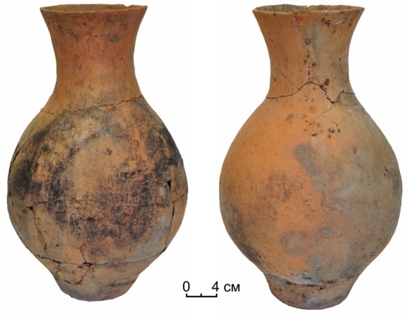 Керамические сосуды с шаровидным туловом, к низу заужены. Горловины заужены. Стенки толстые.