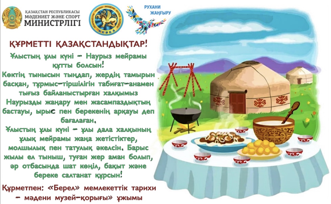 Жер-дүниені жаңартып, көктемді ерте келетін Ұлыстың Ұлы күні - Наурыз мерекесі құтты болсын! Барлықтарыңызға татулық, береке - бірлік тілейміз. Ұлыстың ұлы күні елімізбен жерімізге құт - береке ала келсін. Ұлыс оң болып, әрбір күніміз Наурыз күніндей шуақты болсын!