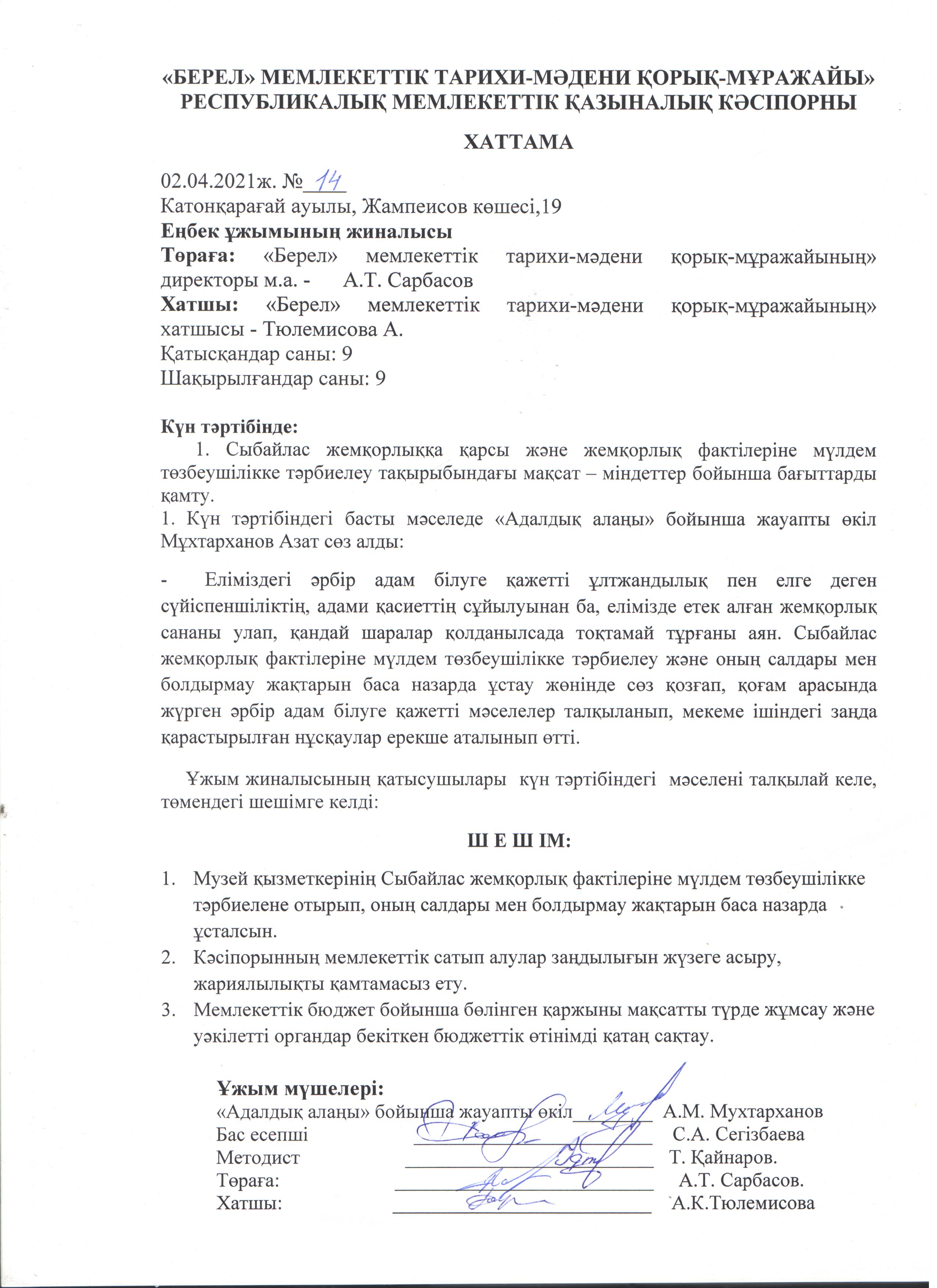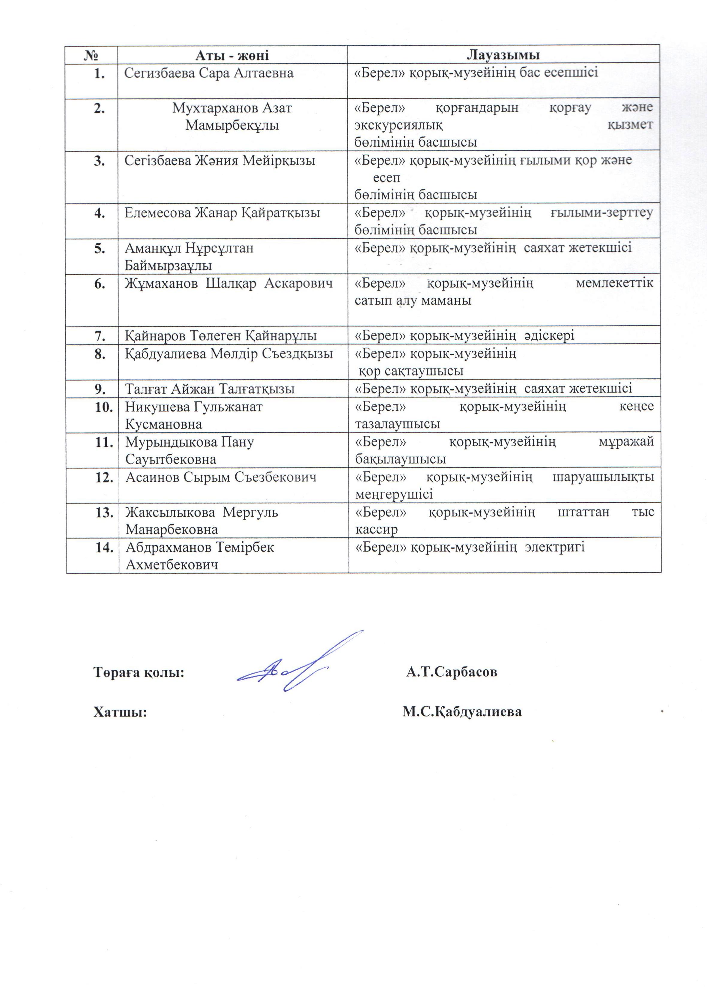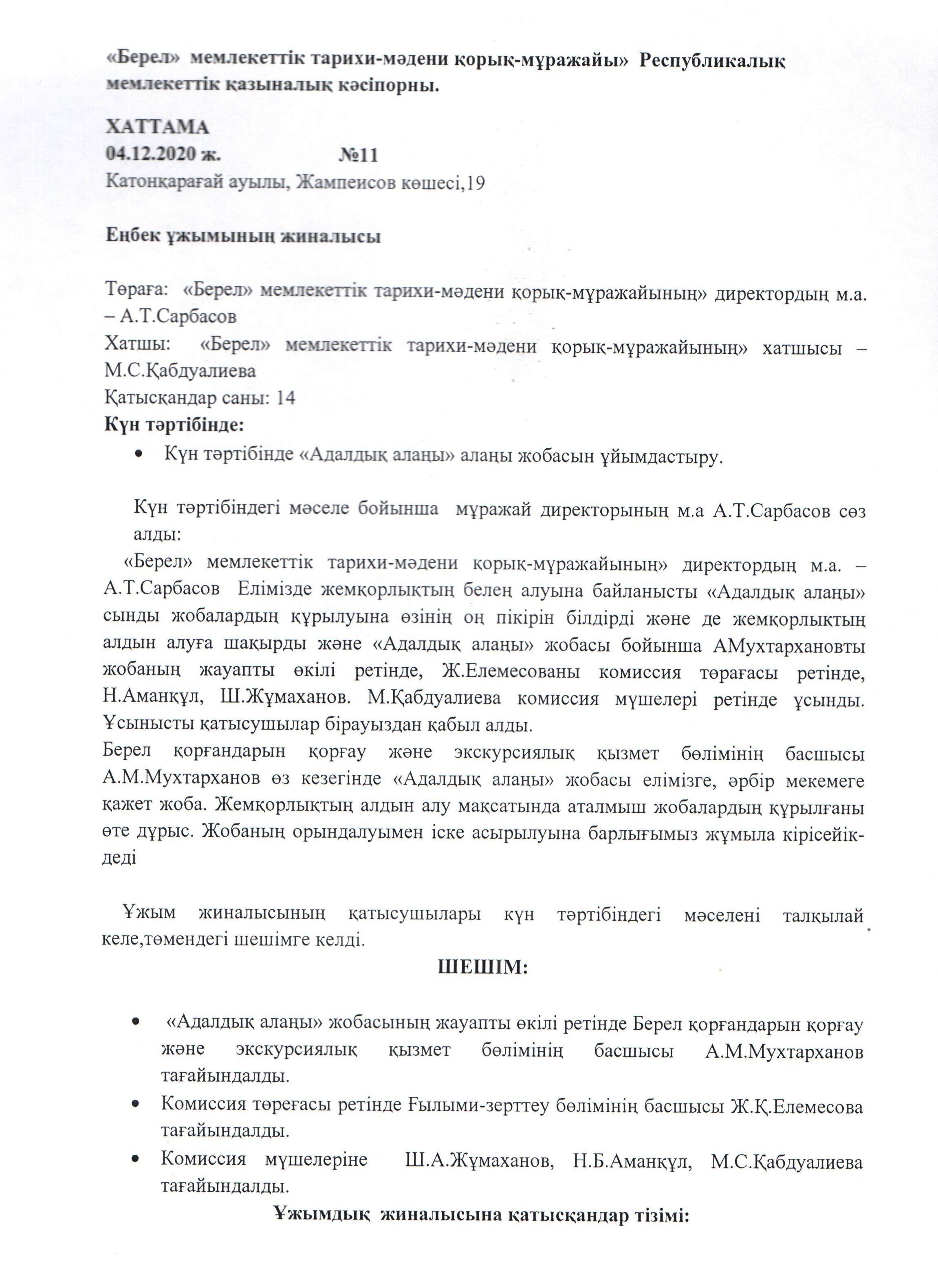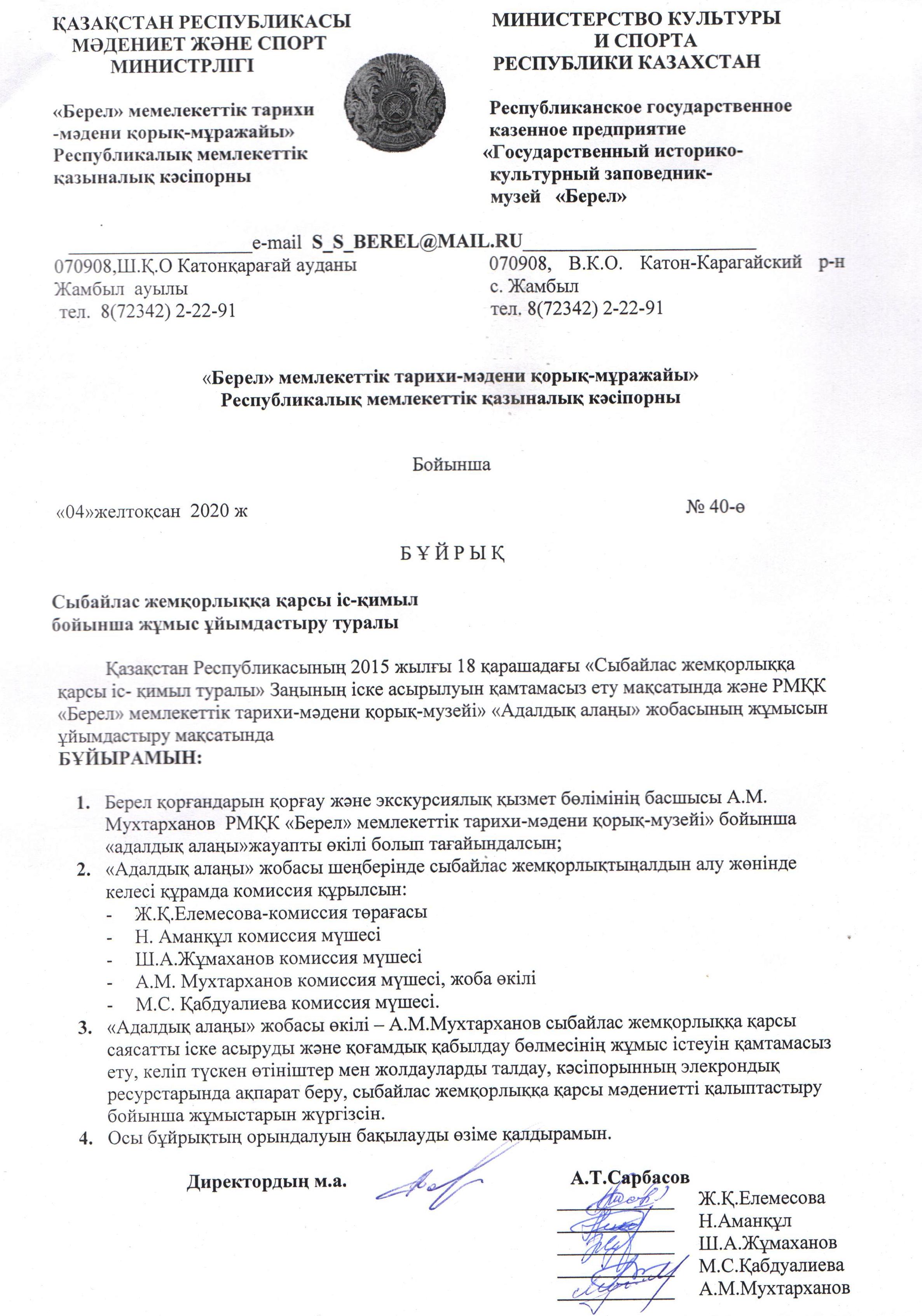 Қазақстан Республикасының 2015 жылғы 18 қарашадағы «Сыбайлас жемқорлыққа қарсы іс-қимыл туралы» Заңының іске асырылуын қамтамасыз ету барысында және «Адалдық алаңы» жобасының жұмысын ұйымдастыру мақсатында «Берел» мемлекеттік тарихи-мәдени қорық-музейі» РМҚК директорының м.а. А.Сарбасовтың 2020 жылдың 4 желтоқсанындағы № 40-ө бұйрығымен «Адалдық алаңы» жобасы шеңберінде сыбайлас жемқорлықтың алдын алу жөнінде халыққа кеңес беру мақсатында азаматтарды қабылдау үшін құрылған комиссия құрамы: