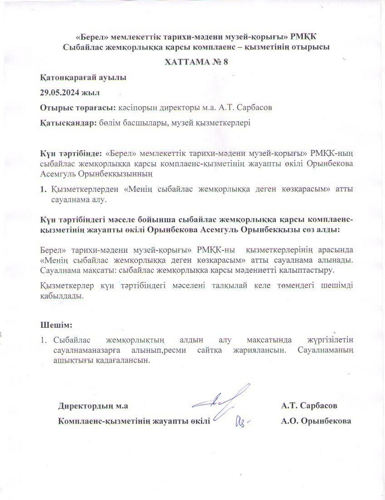 "Берел" мемлекеттік тарихи-мәдени музей-қорығы РМҚК қызметкерлерінен «Сыбайлас жемқорлыққа қарсы күрес – бүгінгі күннің талабы» тақырыбында сауалнама алынды.