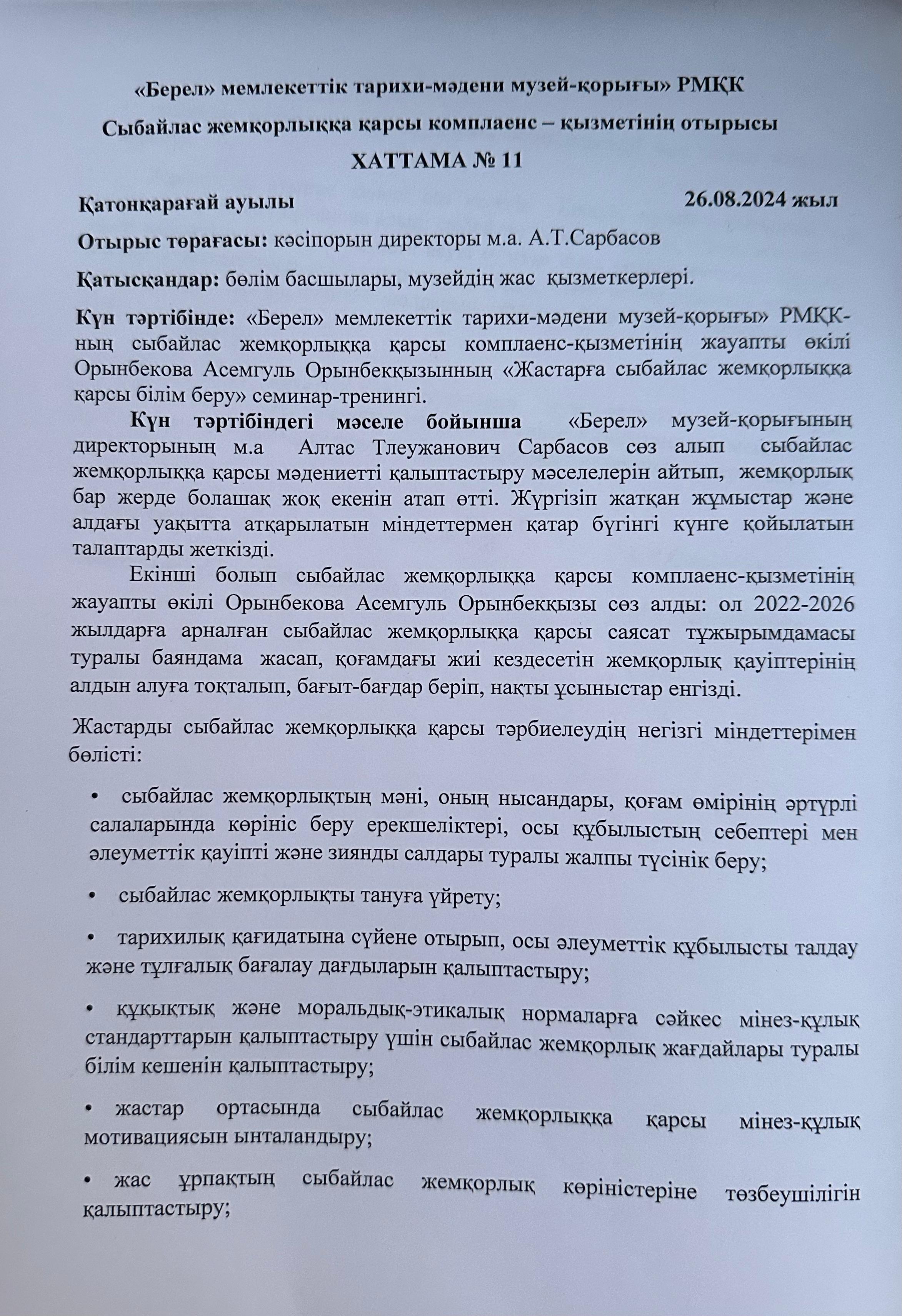 «Берел» мемлекеттік тарихи-мәдени музей-қорығы» РМҚК-ның сыбайлас жемқорлыққа қарсы комплаенс-қызметінің жауапты өкілі Ерланова Жанат Ерлановна «Берел» мемлекеттік тарихи-мәдени музей-қорығы» қызметкерлеріне комплаенс-қызметі жайлы отырыс өткізді. Отырыс барысында қызметкерлерге комплаенс-қызметінің маңыздылығы мен мақсаты түсіндірілді. Сыбайлас жемқорлықтың тәуекелдері мен алдын-алу шараларына талдау және сыбайлас жемқорлыққа қарсы мәдениетті қалыптастыру жұмыстары жүзеге асырылды. Сыбайлас жемқорлыққа қарсы комплаенс-қызметі - «Сыбайлас жемқорлыққа қарсы іс-қимыл туралы» бекітілген ережесінің аясында жұмыс атқарады.
