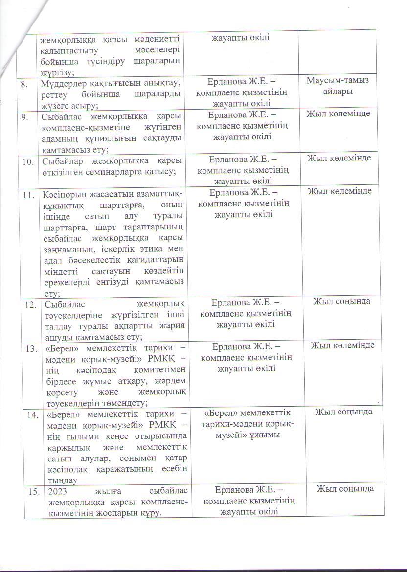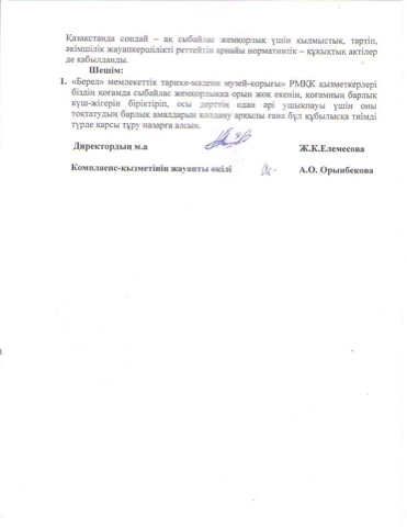 «Берел» мемлекеттік тарихи-мәдени қорық-музейі» РМҚК –нің Сыбайлас жемқорлыққа қарсы комплаенс –қызметі