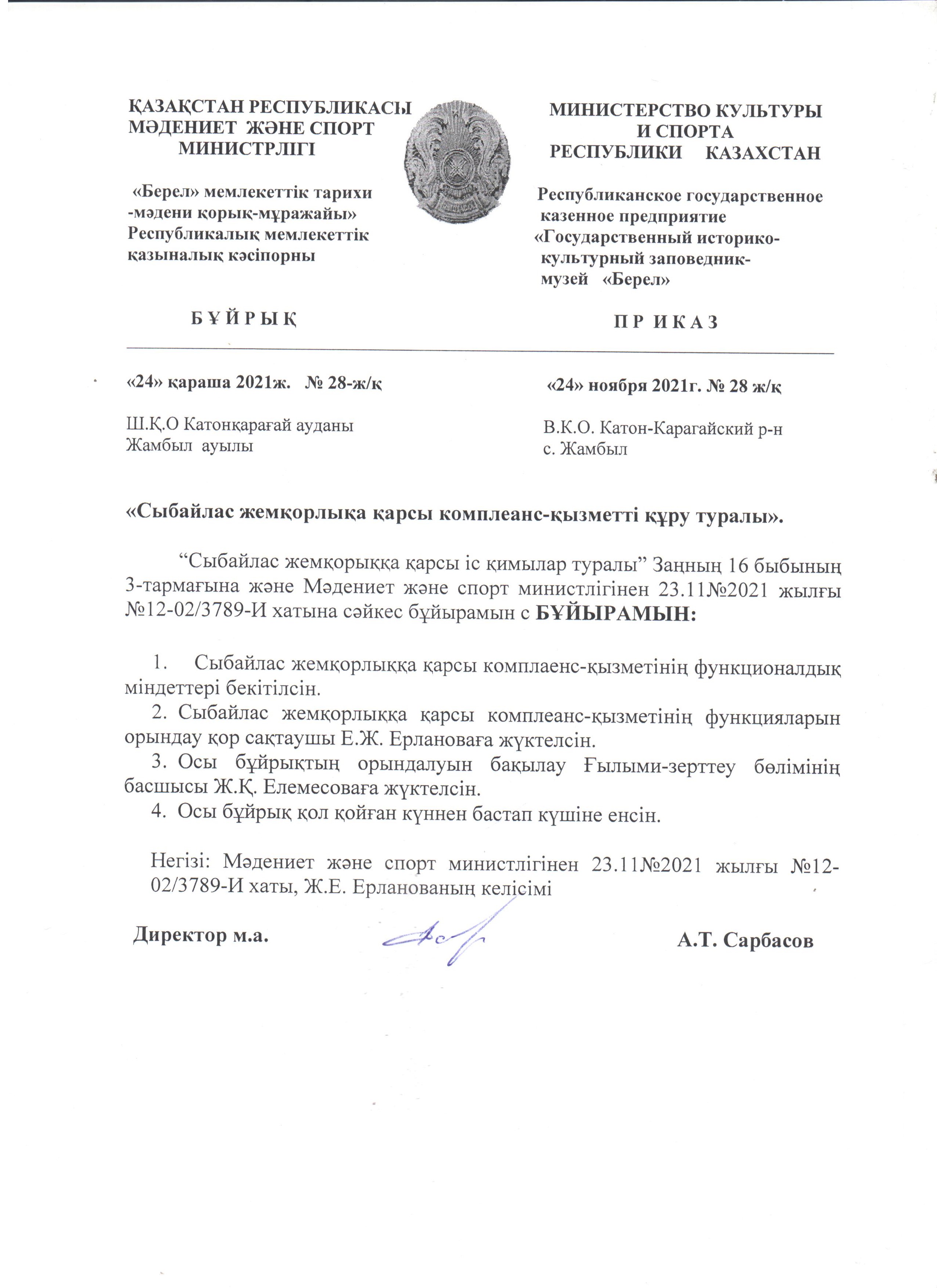 «Сыбайлас жемқорлыққа қарсы іс-қимыл туралы» Заңның 16-бабының 3-тармағына сәйкес, «Берел» мемлекеттік тарихи-мәдени қорық-музейі» РМҚК сыбайлас жемқорлыққа қарсы комплаенс-қызметінің міндетін орындауды Ерланова Жанат Ерлановнаға оның келісімінің негізінде, «Берел» мемлекеттік тарихи-мәдени қорық-музейі» РМҚК директорының м.а. А.Сарбасовтың 2021 жылдың 24 қарашасындағы № № 28-ж/қ бұйрығымен тапсырылған болатын. Комплаенс-қызметкерінің басты мақсаты мен міндеті Қазақстан Республикасының Сыбайлас жемқорлыққа қарсы іс-қимыл туралы («Сыбайлас жемқорлыққа қарсы іс-қимыл туралы 2015 жылғы 18 қарашадағы № 410-V Қазақстан Республикасының Заңы» 19.12.2020 ж. жағдай бойынша өзгерістер мен толықтырулармен;) заңнамасының сақталуын қамтамасыз ету болып табылады.
