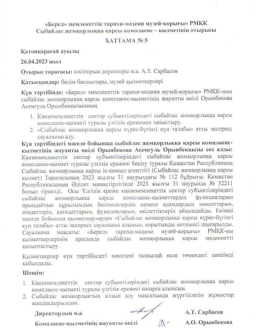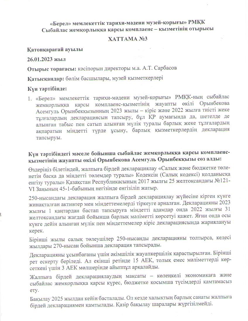 «Берел» мемлекеттік тарихи-мәдени музей-қорығының» РМҚК Сыбайлас жемқорлыққа қарсы комплаенс – қызметкері 2023 жылдың 23 ақпанында жиналыс өткізді.