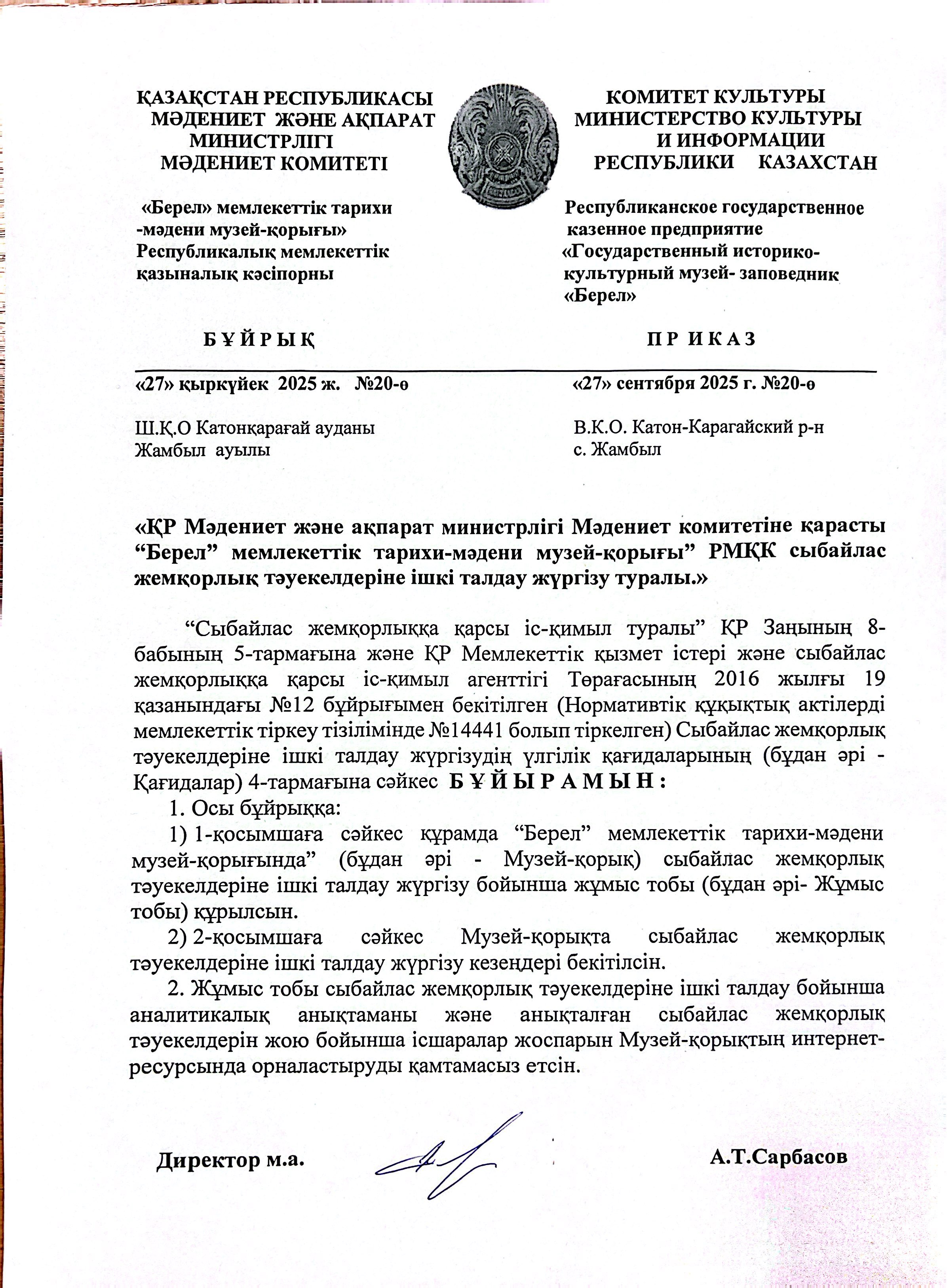 «ҚР Мәдениет және ақпарат министрлігі Мәдениет комитетіне қарасты "Берел" мемлекеттік тарихи-мәдени музей-қорығы" РМҚК сыбайлас жемқорлық тәуекелдеріне ішкі талдау жүргізу туралы.»
