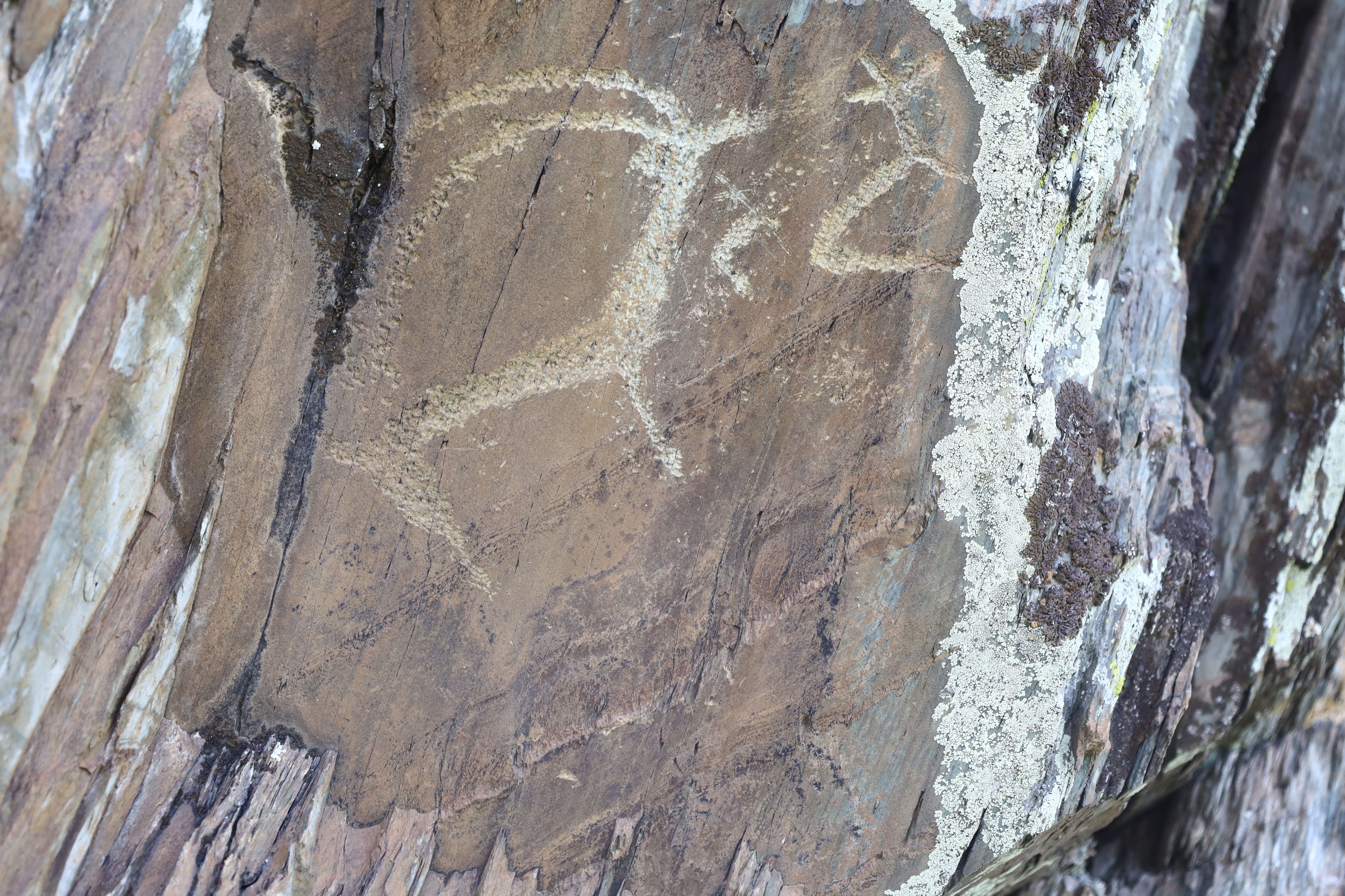 Әсіресе, Шілікті мен Жалаулыдан табылған алтын әшекейлерде, сондай-ақ Жетісудағы Ешкіөлмес петроглифтерінде кездесетін бейнелерге ұқсас келген, басын артқа қаратқан қыран бейнесі (Сурет 5) ерекше назар аудартады. Сонымен қатар, тұяғының ұшымен тұрған, шоқтығы үшбұрыш, көзі дөңгелек және мүйізді әсемделген бұғы фигуралары көркемдік талғампаздығымен ерекшеленеді (Сурет 6).