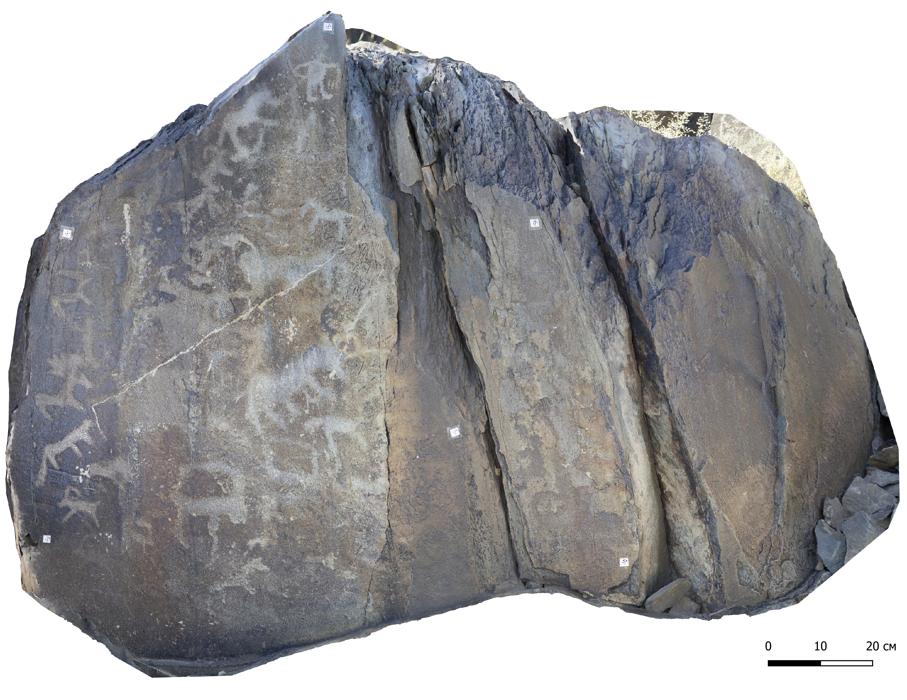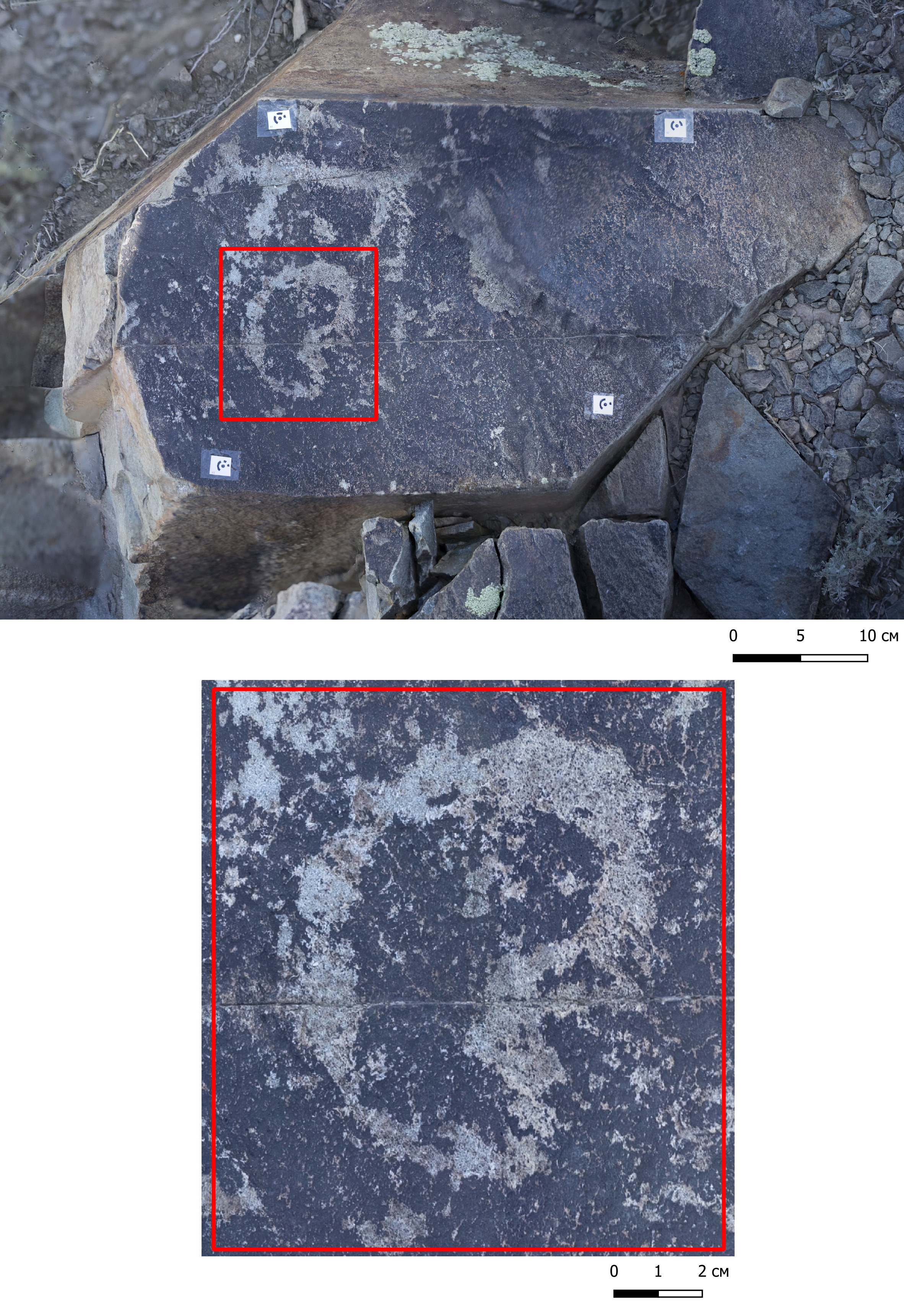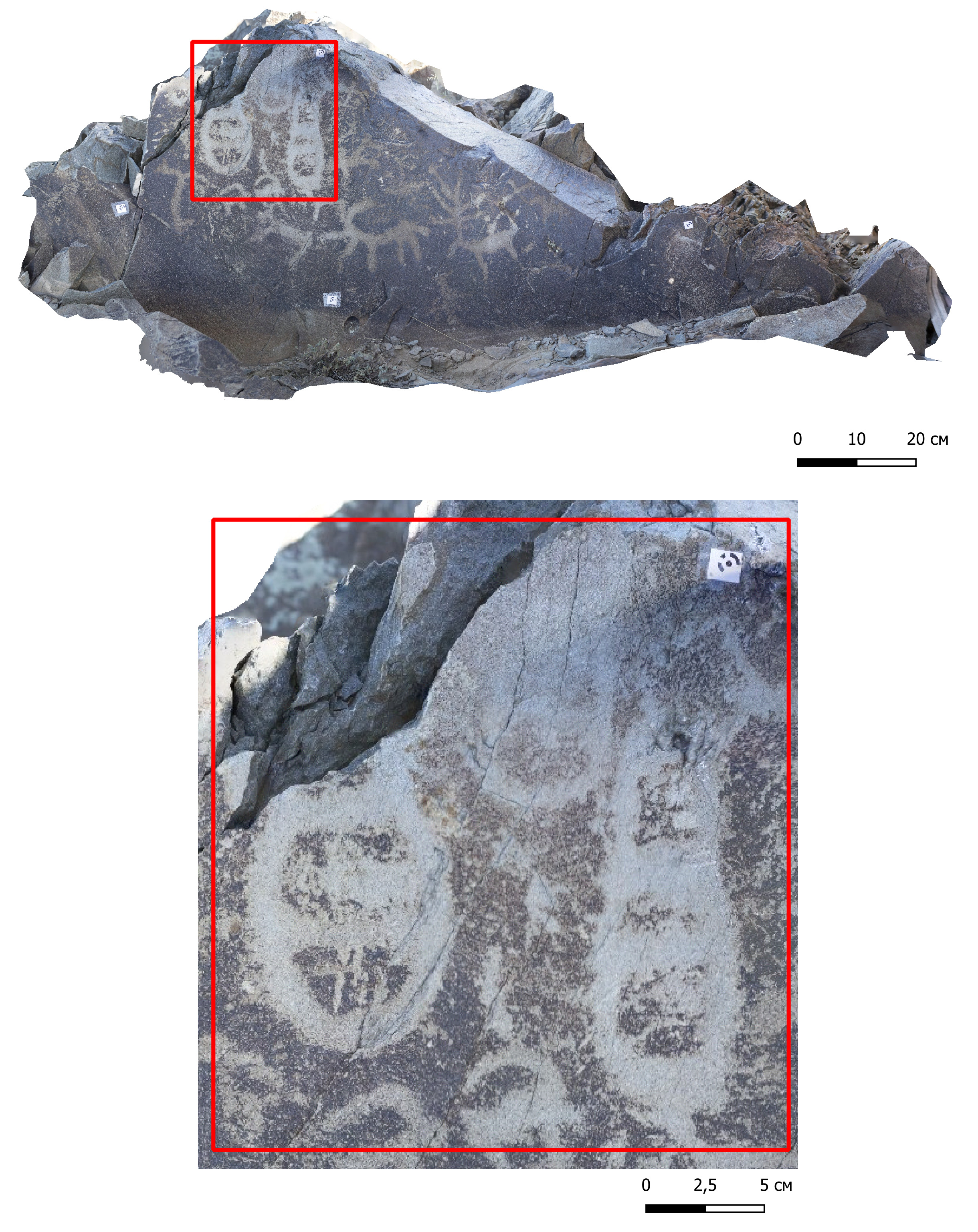 Түлкіне ескерткішінде белгілер мен символдар бедерленген 6 бет анықталып отыр. Бірінші бет (WGS1984 координаттары: 48°35'31.20"N 83°51'59.39"E) көкжиектен 45 градус экспозицияда тұр. Бетінде бір белгі бар (Сурет 2). Екінші бет (WGS1984 координаттары: 48°35'30.20"N 83°52'0.72"E) көкжиектен 45 градус экспозицияға ие. Бетінде үш белгі бар (Сурет 3). Үшінші бет (WGS1984 координаттары: 48°35'30.69"N 83°52'1.16"E) көлденең жатыр. Бетінде бір белгі бар (Сурет 4). Төртінші бет те (WGS1984 координаттары: 48°35'30.62"N 83°52'1.84"E) көлденең жатыр. Бетінде бірнеше белгілер бар (Сурет 5). Бетінің бір бөлігіне қазіргі заманғы бүлдіргіштер әдепсіз суреттер салып бүлдірген. Бесінші бет (WGS1984 координаттары: 48°35'30,33"N 83°52'1,56"E) тігінен тұр. Бетінде бір белгі бар (Сурет 6). Алтыншы бет те (WGS1984 координаттары: 48°35'29.72"N 83°52'0.54"E) тігінен тұр. Бетінде көптеген бейнелер бар (Сурет 7).