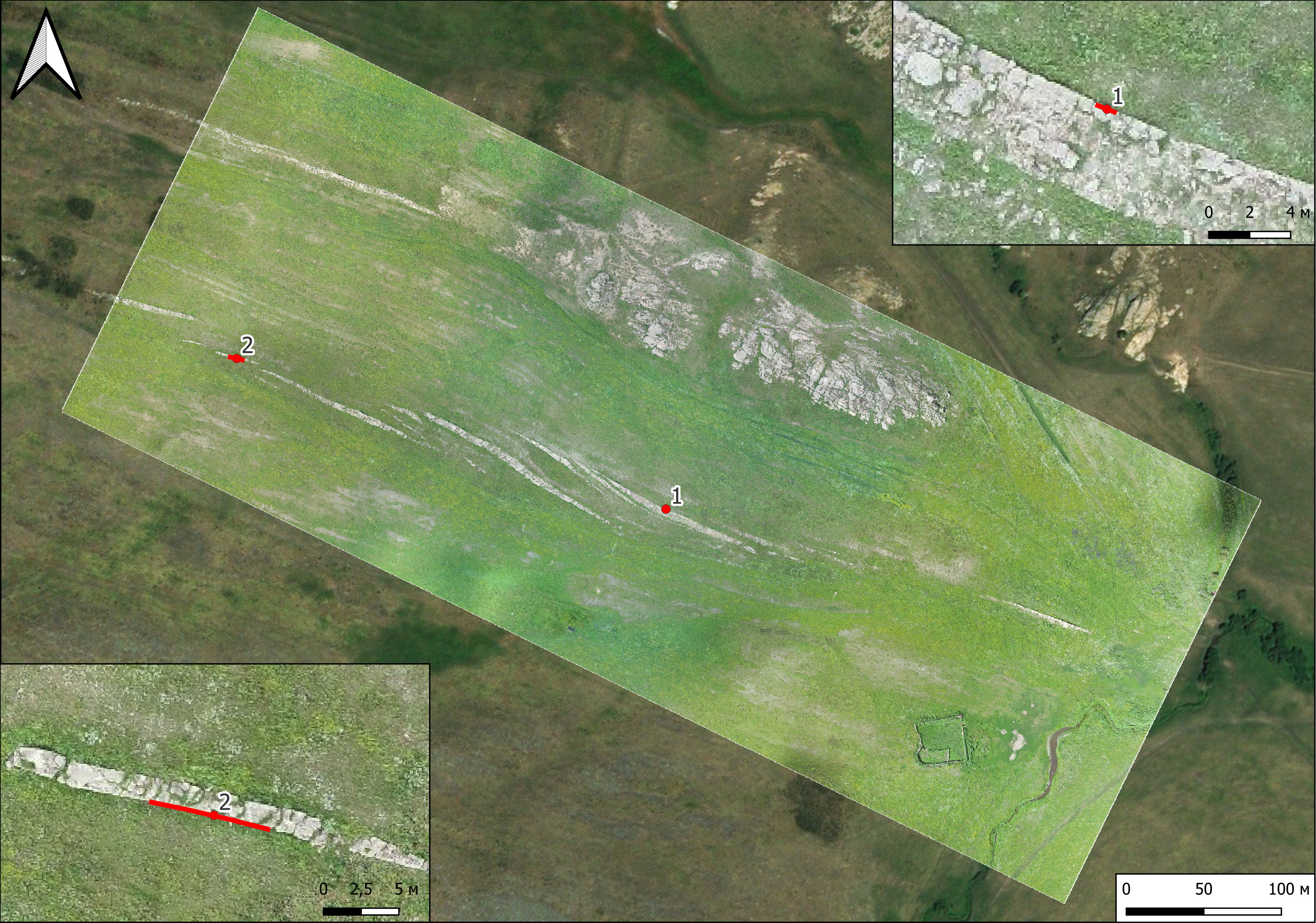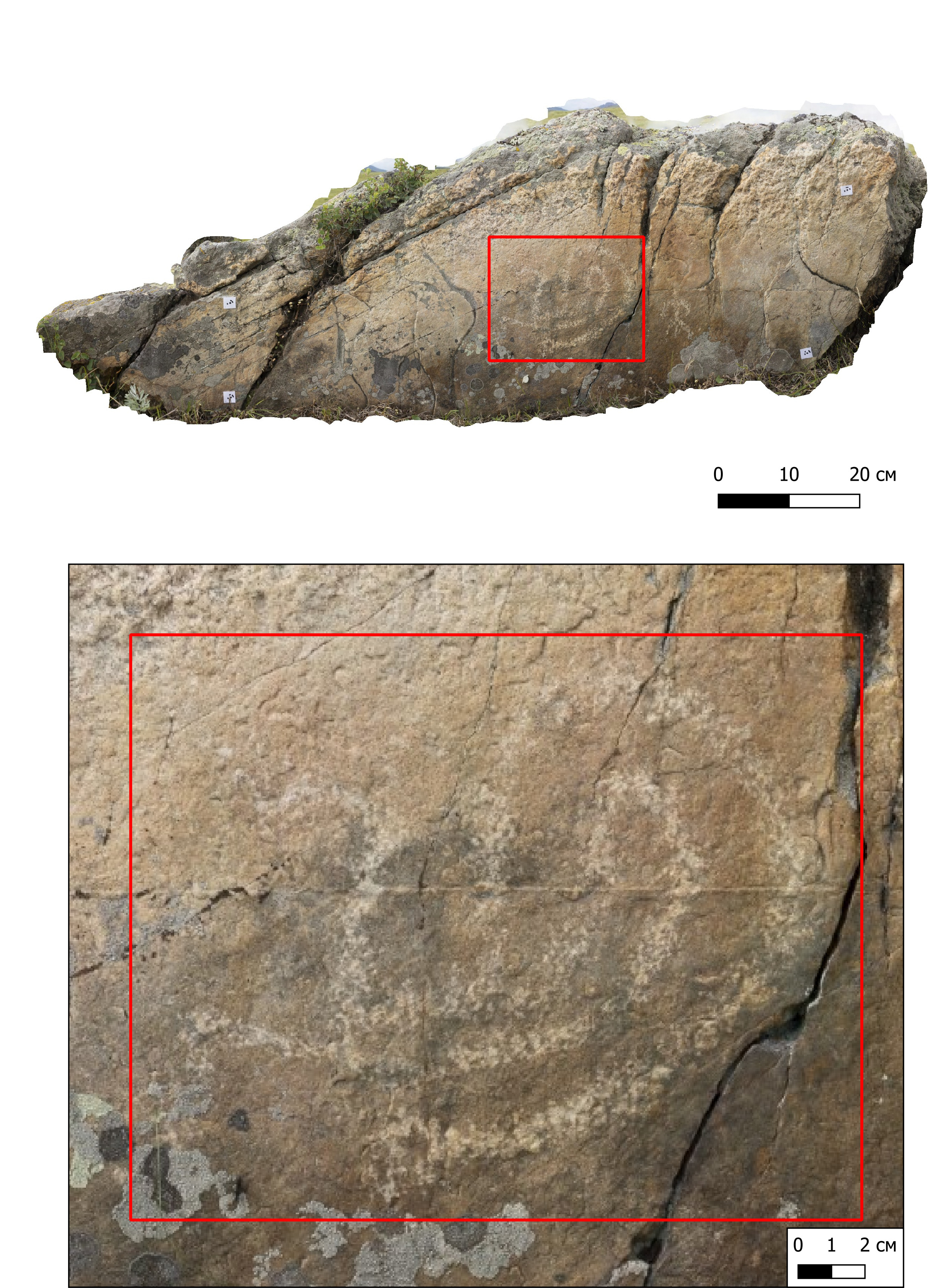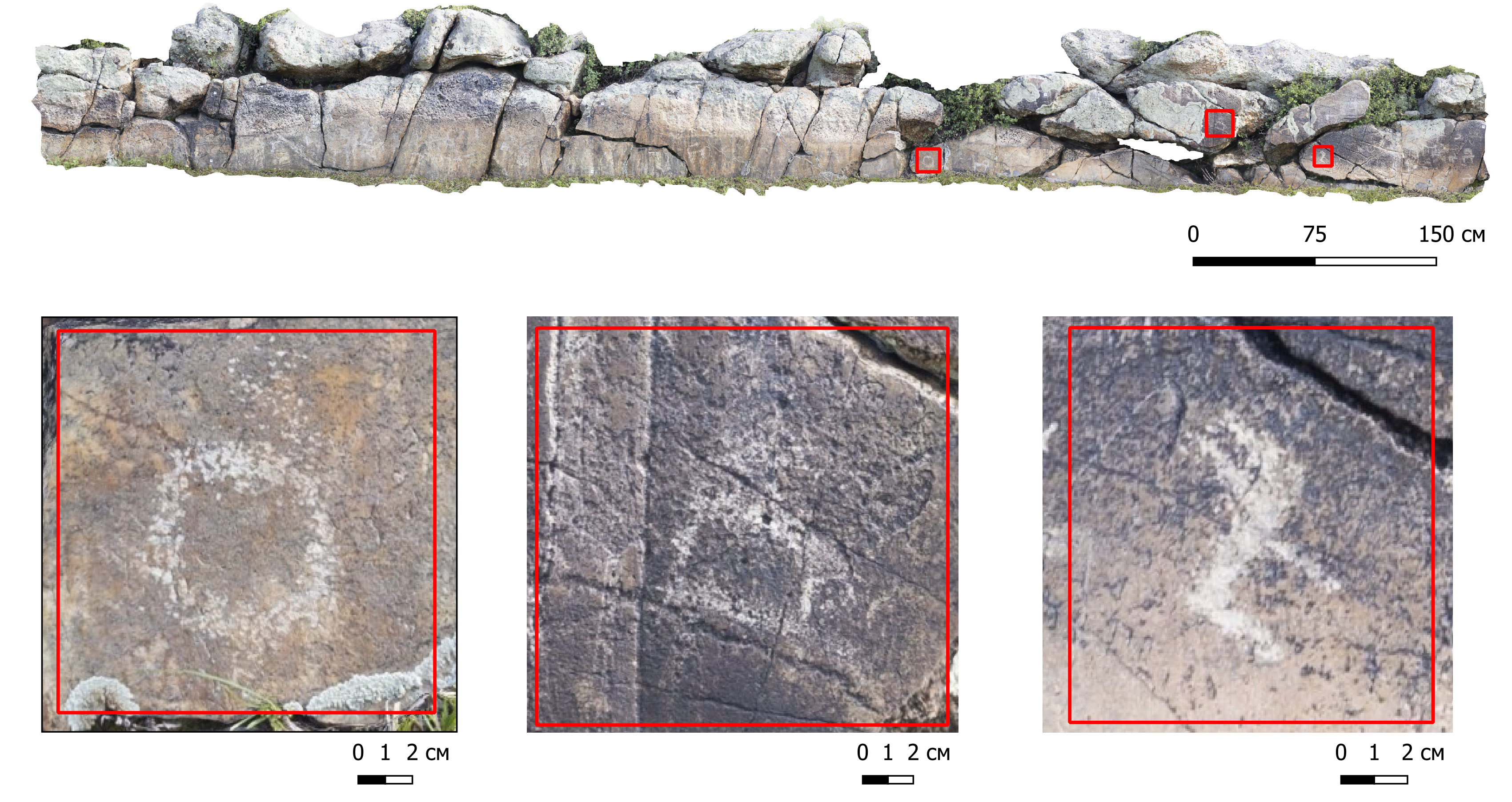 Қарымсақ ескерткішінде белгілер мен белгілер табылған екі бет (тас беті) анықталды. Бірінші бет (WGS1984 координаттары: 49°40'30,88"N 82°37'15,00"E) тік экспозицияда тұр. Екі элемент бедерленген – белгі және адамның бейнесі (Сурет 2). Екінші бет те (WGS1984 координаттары: 49°40'34.01"N 82°37'1.19"E) тік экспозицияда. Оның бетінде бейнелер көп, белгілер саны – 3 белгі (Сурет 3).