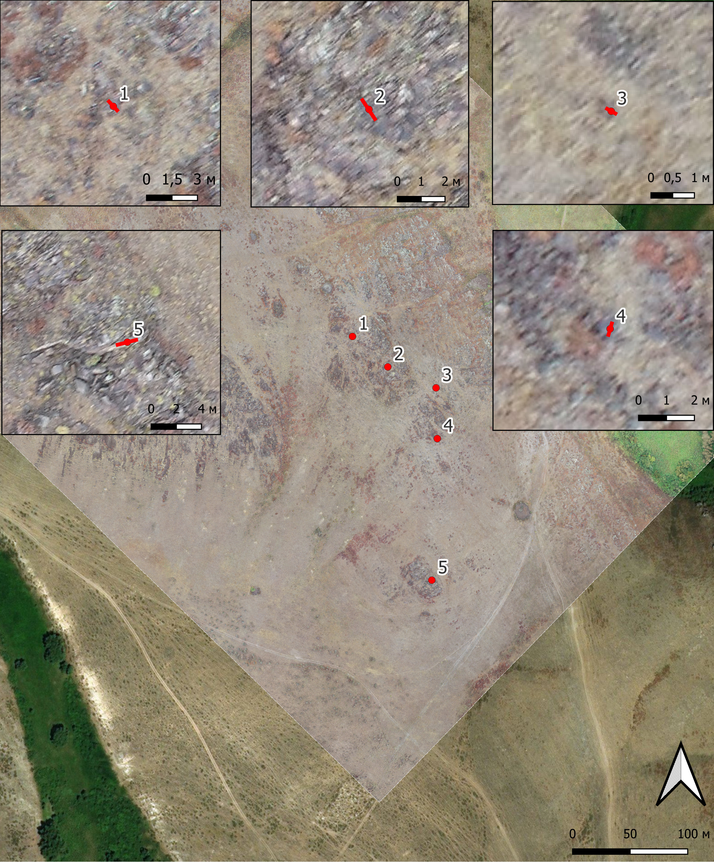 Общее количество камней с петроглифами составляет около 400, однако их распределение по условно выделенным группам неравномерно, что связано с воздействием природных факторов. Наибольшая концентрация рисунков наблюдается во второй и третьей группах. Петроглифы в основном высечены на вертикальных и наклонных поверхностях, реже — на горизонтальных. Плоскости с изображениями преимущественно ориентированы на юг, реже — на восток и юго-запад, и лишь изредка — на север.