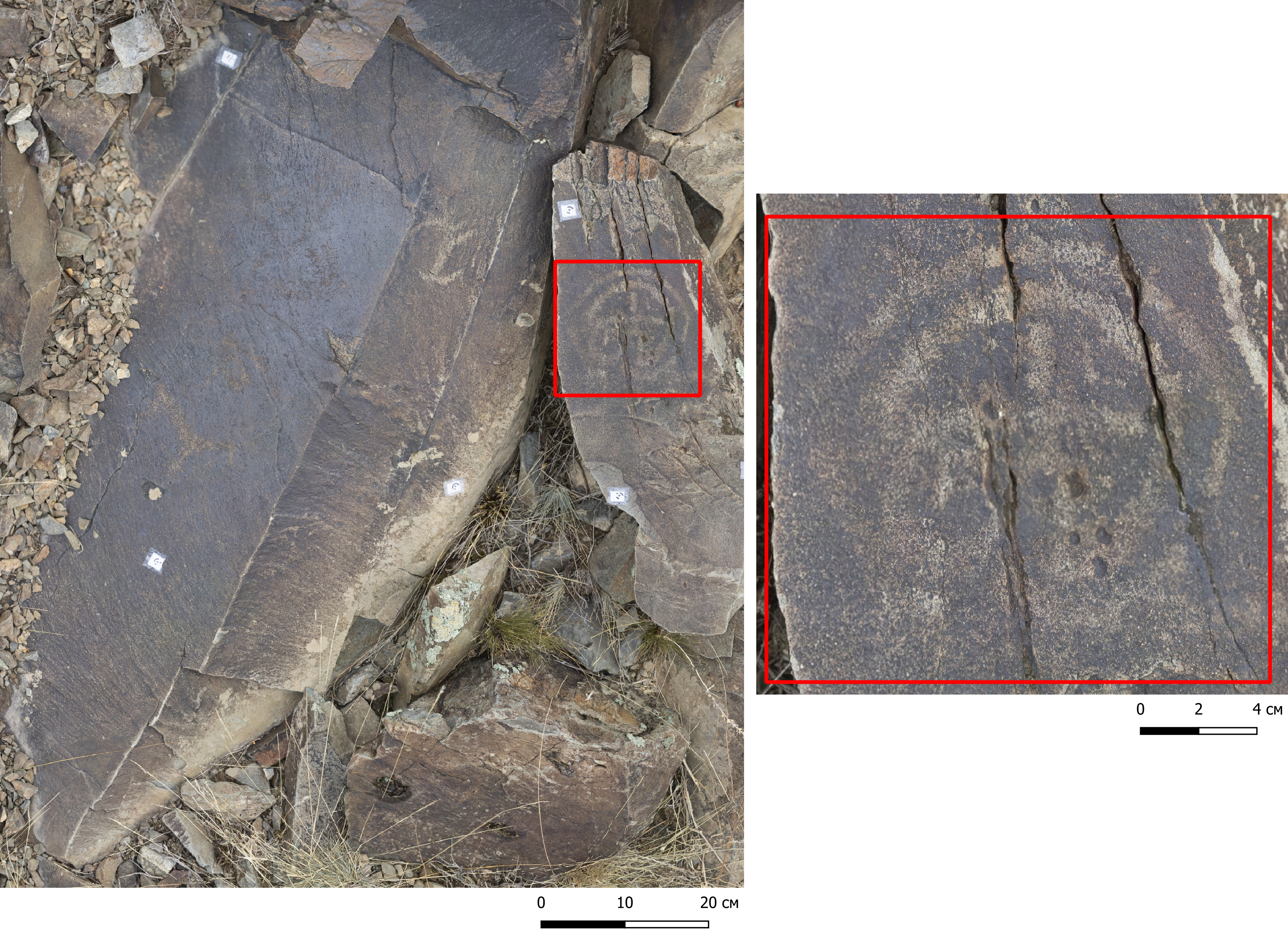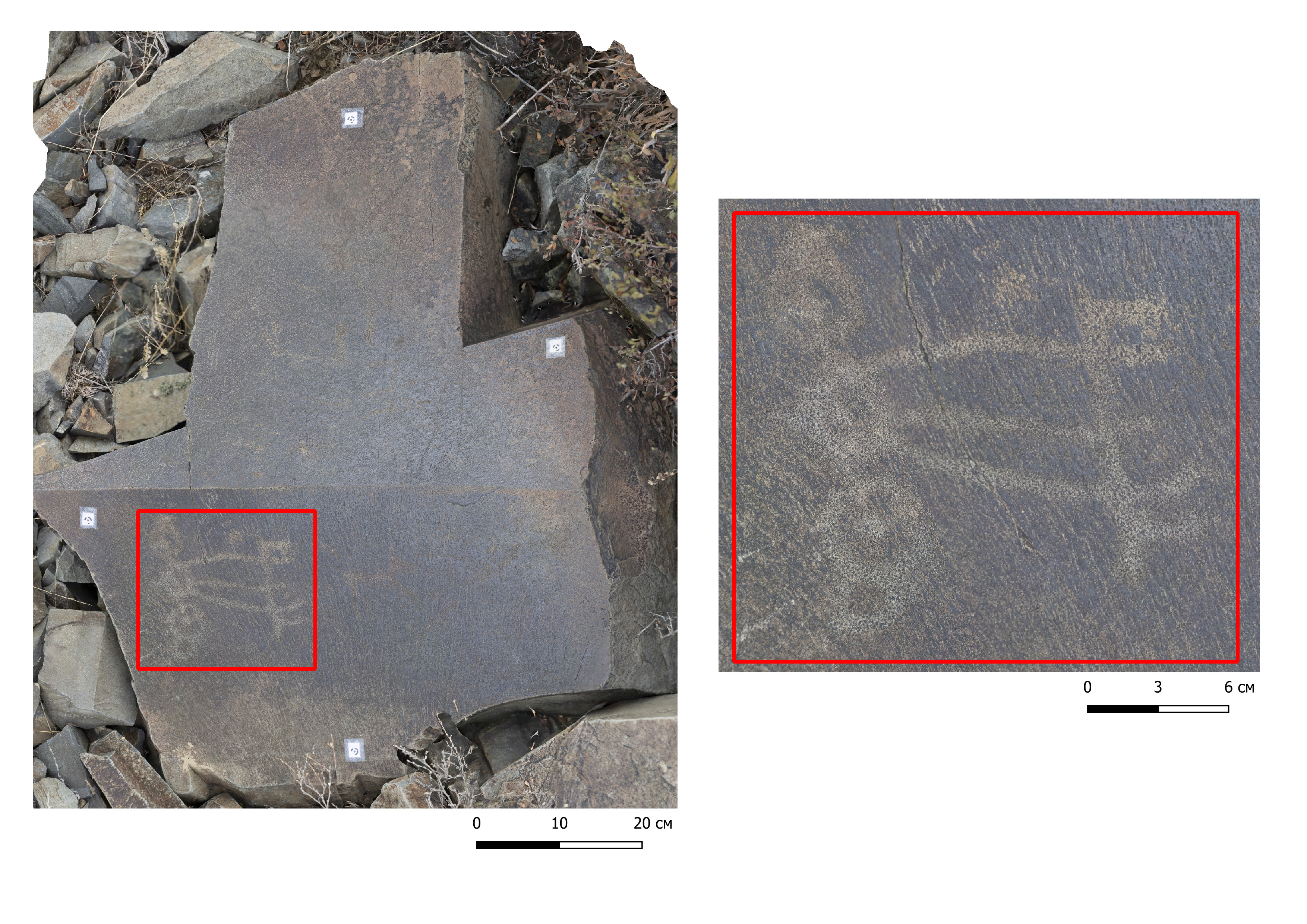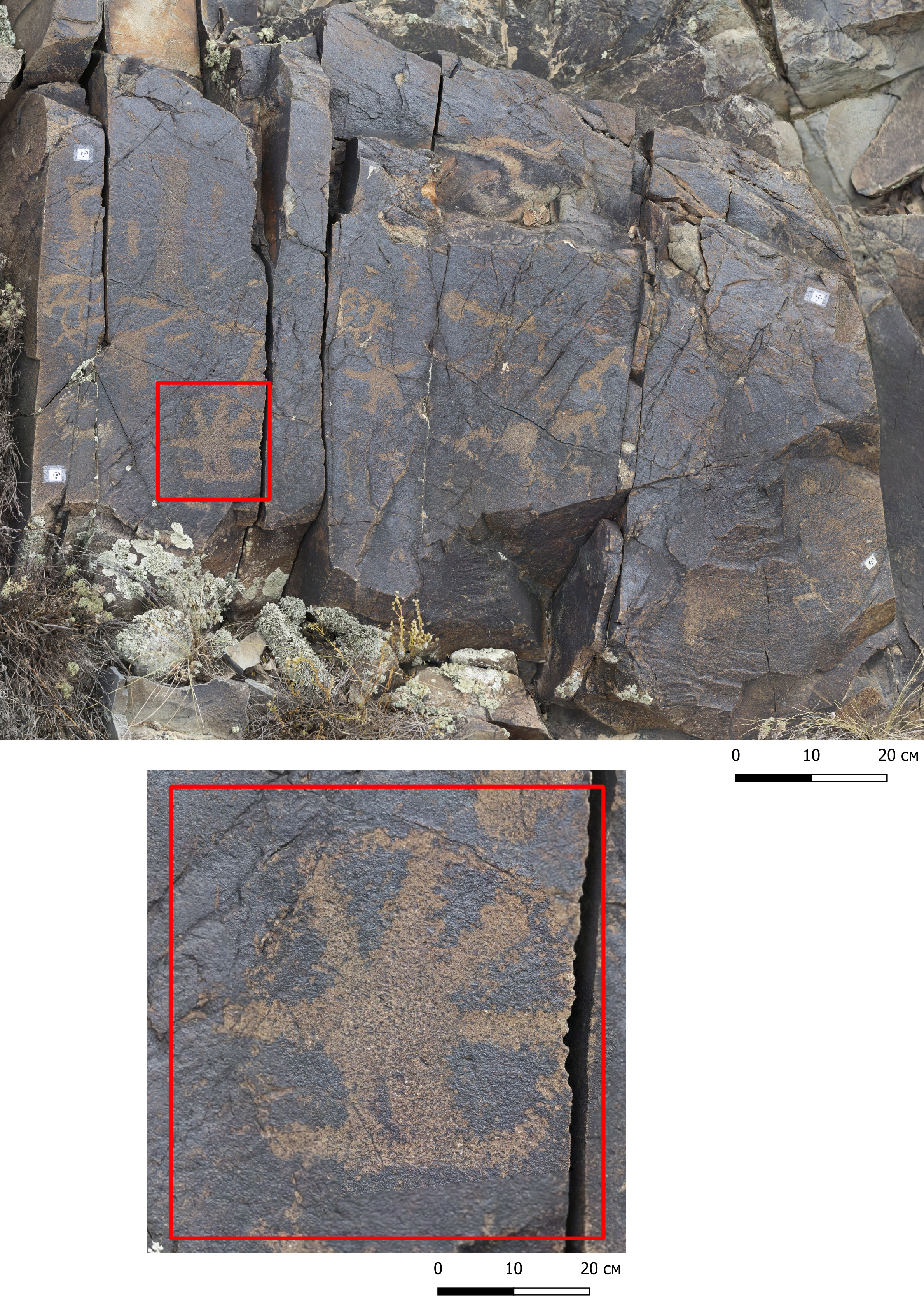 На памятнике Мойнак выявлено 5 поверхностей, где встречены знаки и символы. Поверхность 1 (координаты WGS1984: 48°36'47.64"N 83°51'53.10"E) имеет горизонтальную экспозицию. На поверхности 1 имеется один знак (Рисунок 2). Поверхность 2 (координаты WGS1984: 48°36'46.79"N 83°51'54.60"E) имеет горизонтальную экспозицию. На поверхности 2 имеется один знак (Рисунок А.46). Поверхность 3 (координаты WGS1984: 48°36'46.20"N 83°51'56.64"E) имеет вертикальную экспозицию. На поверхности 3 имеется один знак (Рисунок А.47). Поверхность 4 (координаты WGS1984: 48°36'44.78"N 83°51'56.69"E) имеет горизонтальную экспозицию. На поверхности 4 имеется одно изображение (Рисунок А.48). Поверхность 5 (координаты WGS1984: 48°36'40.81"N 83°51'56.46"E) имеет вертикальную экспозицию. На поверхности 5 имеется множество изображений (Рисунок А.49).