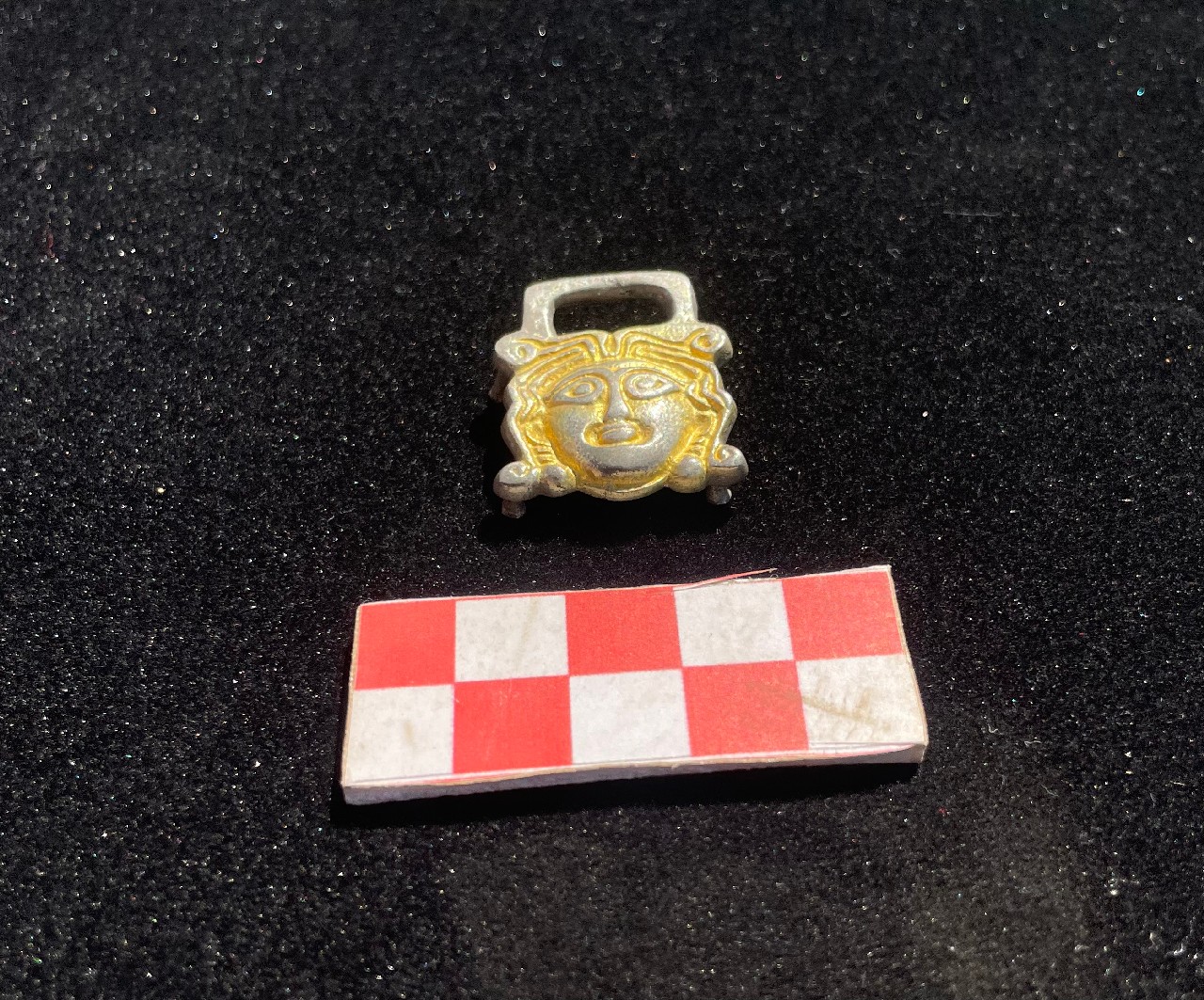 Бляшка с изображением головы человека имеется крупная прямоугольная прорезь с закругленными краями. Детально проработаны черты глаза, нос, брови,рот,уши. Металл – серебро с позолотой.